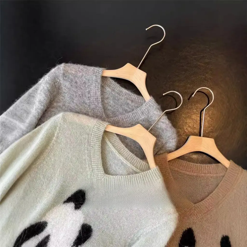Women's V-neck Thin Wool Knit Sweater Sulley Alpaca Panda Jacquard Early Autumn Fashionable Sleeve Length Open Cardigan