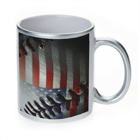 KuzmarK Silver Sparkle Coffee Cup Mug 11 Ounce - American Flag Baseball Stitch