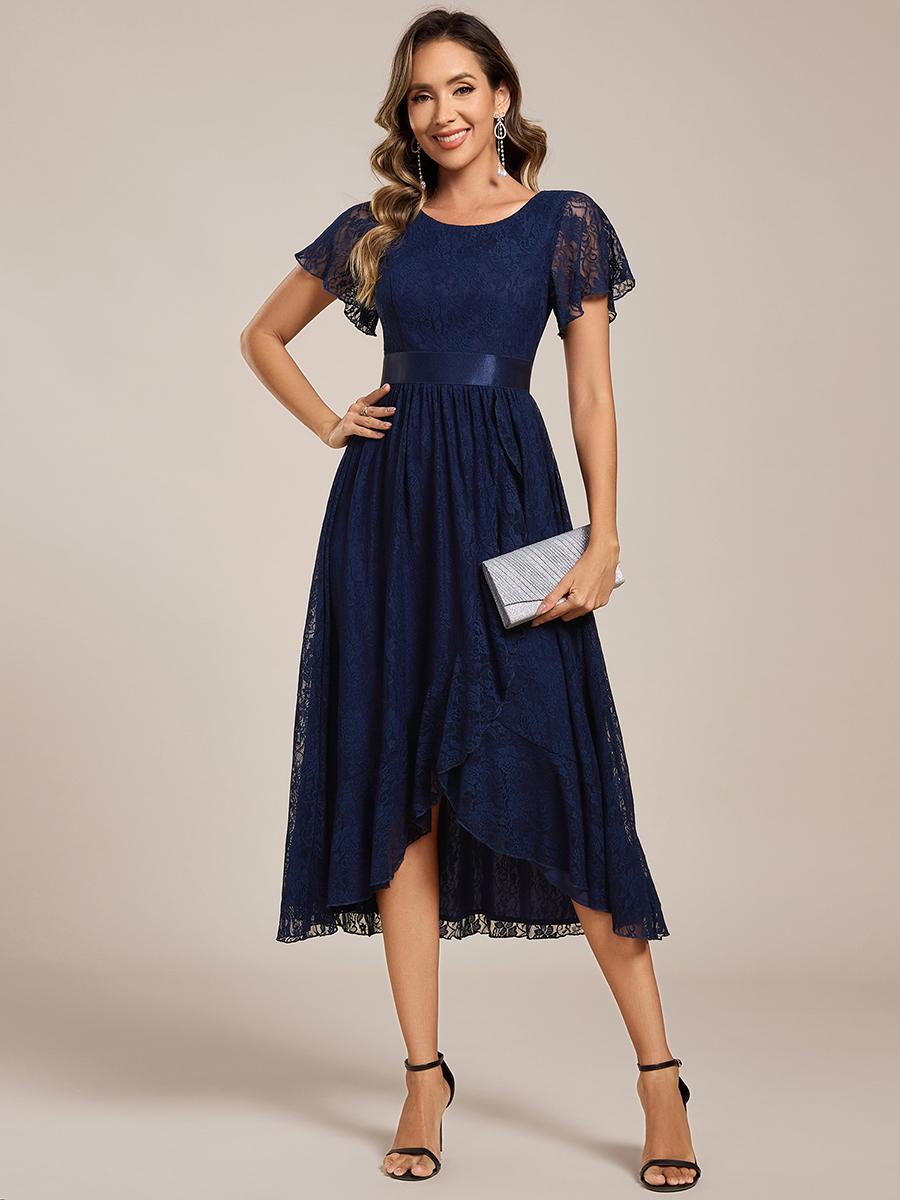 Ever-Pretty женские вечерние платья миди с коротким рукавом, круглым вырезом, кружевом и асимметричным подолом M темно-синий