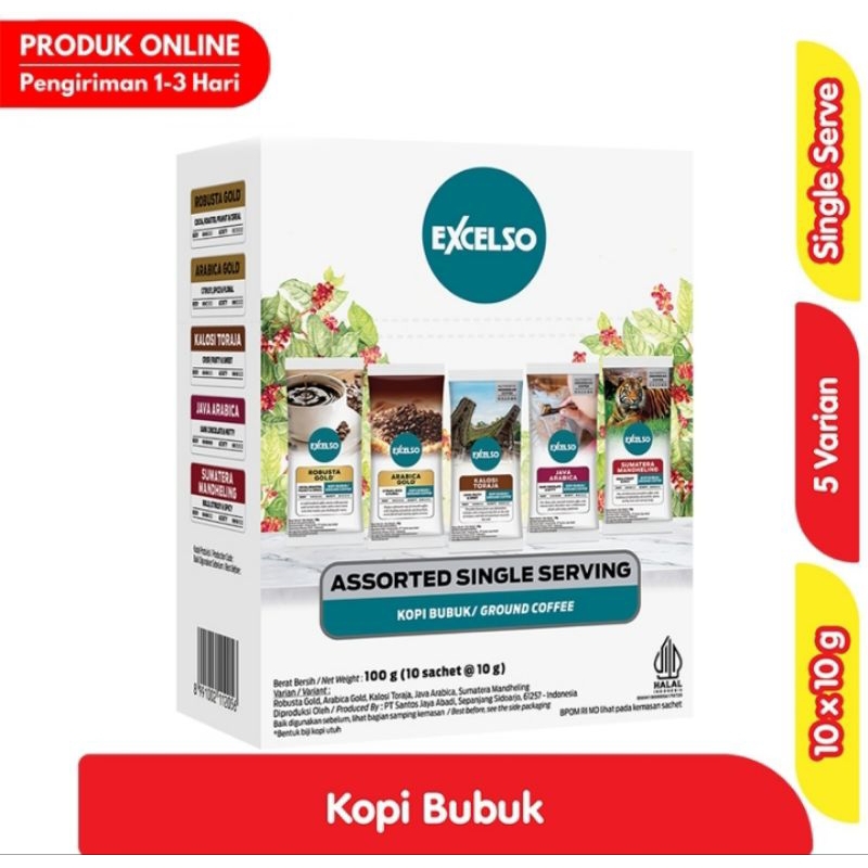 Excelso Assorted Single Serving 10 x 10 g adalah kopi bubuk dalam kemasan yang terdiri dari 5 varian rasa kopi dalam satu box. Box ini berisi 10 sachet kopi, terdapat 2 sachet untuk setiap varian rasa kopi. Cocok untuk kamu yang suka mencoba berbagai varian rasa kopi. 5 varian kopi tersebut diantaranya adalah Excelso Robusta Gold, Excelso Arabica Gold, Excelso Kalosi Toraja, Excelson Sumatera Mandheling, dan Excelso Java Arabica.