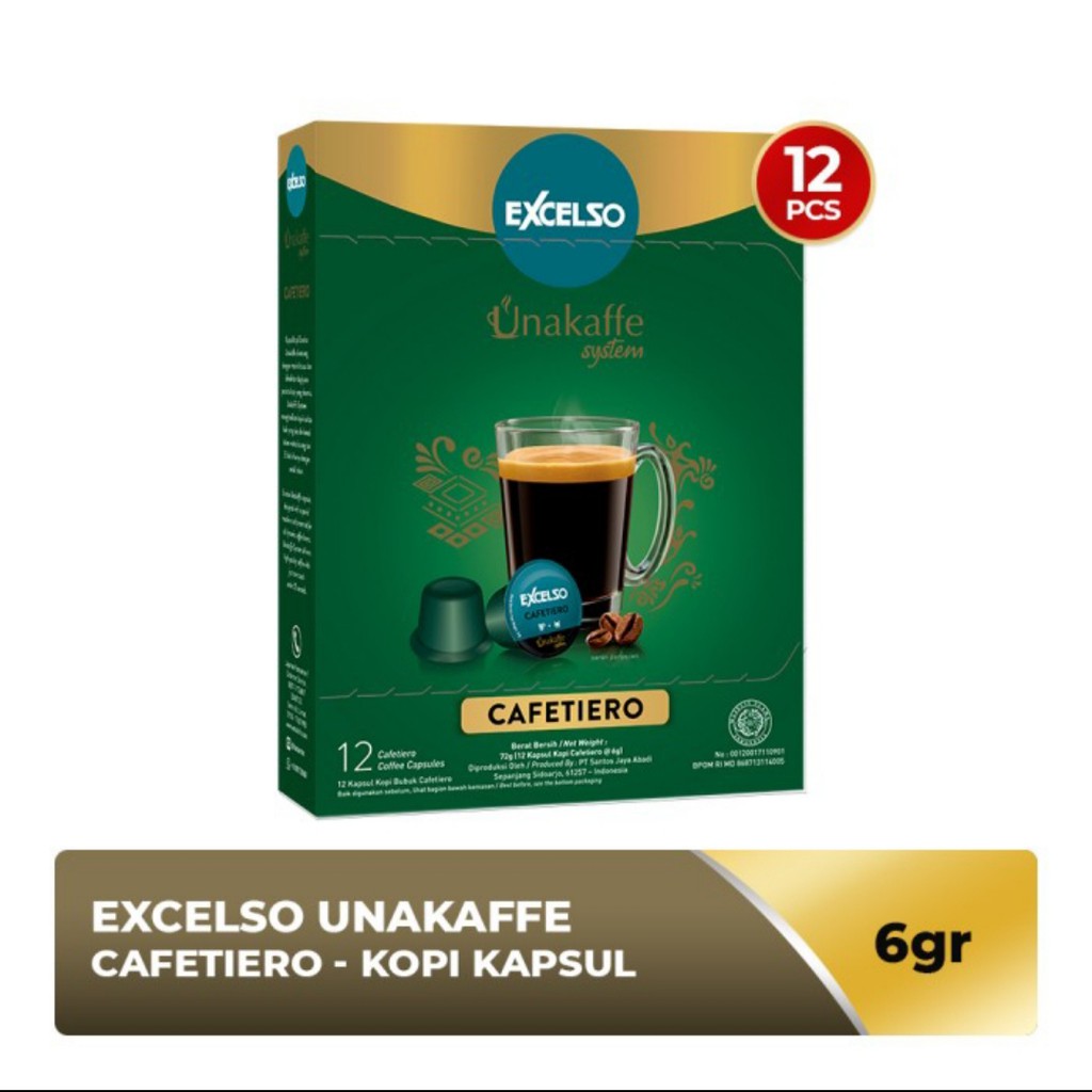 Excelso Unakaffe Cafetiero merupakan campuran biji kopi Arabika Kolombia & Guatemala, Cafetiero kami memiliki aroma karamel dan kacang-kacangan yang lembut, tingkat kepekatan yang lebih ringan, serta rasa jeruk yang menyegarkan | Excelso Unakaffe menawarkan cara baru membuat secangkir kopi berkualitas. Dengan kapsul kopi yang mudah digunakan dan dirancang khusus untuk mesin kopi Excelso Unakaffe. Kapsul Kopi Excelso Unakaffe dirancang dengan mesin khusus dan dihadirkan bagi para pecinta kopi yang dinamis. Unakaffe System menghasilkan kopi kualitas baik yang siap dinikmati dalam waktu kurang dari 35 detik hanya dengan sekali tekan
