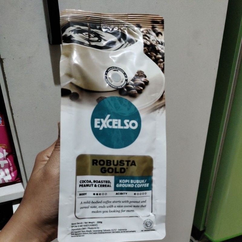 Excelso Robusta Gold merupakan 100% campuran kopi robusta terbaik yang di kelola secara profesional khusus untuk menghasilkan rasa yang berkualitas. sehingga memberikan citarasa dan aroma sangrai (smoky) antara kacang dan sereal yang istimewa dan di akhiri dengan citarasa coklat.