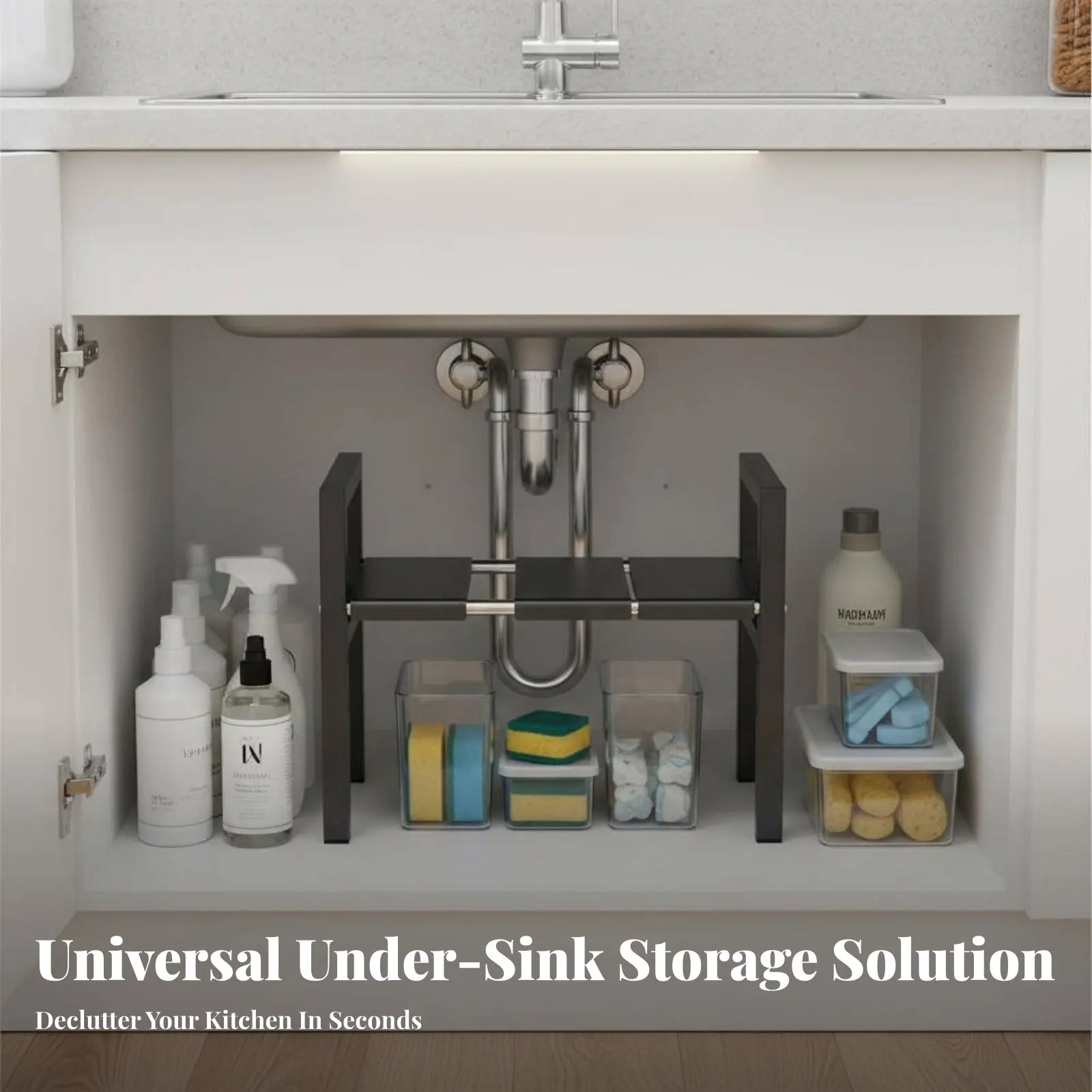 Expandable Under-Sink Rack Easy to Install 2-Tier Adjustable Shelf Robust Duty Anti-Rust for Renters, Adults, Kitchen, Bathroom