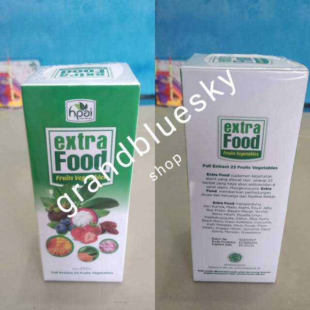 Extra Food HPAI, adalah makanan kesehatan alami yang dibuat dari sinergi 23 herbal buah-buahan dan sayuran yang kaya akan antioksidan & serat alami. Extra Food HPAI diformulasikan sebagai makanan suplemen herba yang berkhasiat untuk mengatasi berbagai penyakit dan bermanfaat bagi kesehatan tubuh. Dengan mengkonsumsi Extra Food HPAI ini akan memberikan perlindungan Anda dan keluarga dari RADIKAL BEBAS.