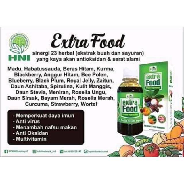 Extra Food HPAI, adalah makanan kesehatan alami yang dibuat dari sinergi 23 herbal buah-buahan dan sayuran yang kaya akan antioksidan & serat alami. Extra Food HPAI diformulasikan sebagai makanan suplemen herba yang berkhasiat untuk mengatasi berbagai penyakit dan bermanfaat bagi kesehatan tubuh. Dengan mengkonsumsi Extra Food HPAI ini akan memberikan perlindungan Anda dan keluarga dari RADIKAL BEBAS. Selain multi manfaat, Extra Food HPAI mempunyai rasa yang manis dan enak dengan tekstur lembut sehingga dapat dikonsumsi anak-anak.