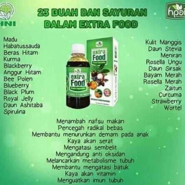 Extra Food HPAI sangat dianjurkan untuk dijadikan sebagai minuman alternatif bagi anak-anak yang tidak suka dengan buah dan sayuran. komponen buah dan sayur yang pas membuat Extra food Hpai sebagai suplemen yang kaya akan manfaatnya bagi kesehatan tubuh, kulit, dan wajah.