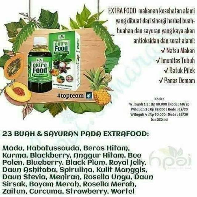 Extra Food HPAI sangat dianjurkan untuk dijadikan sebagai minuman alternatif bagi anak-anak yang tidak suka dengan buah dan sayuran. komponen buah dan sayur yang pas membuat Extra food Hpai sebagai suplemen yang kaya akan manfaatnya bagi kesehatan tubuh, kulit, dan wajah.