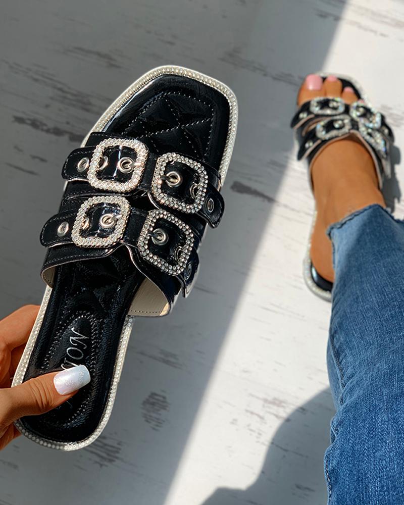 Eyelet Buckled Square Toe Rhinestone Flat Sliders, Black