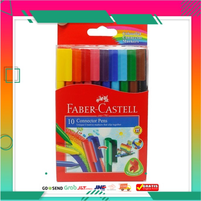 Faber Castell Connector Pen ialah spidol warna yang dapat digabungkan dengan spidol connector lainnya agar tidak hilang atau dapat dirangkai menjadi aneka bentuk craft untuk melatih kreatifitas anak. Dengan warna yang cerah serta banyak pilhan warna, tidak mengandung racun dan aman untuk anak-anak. Dapat dicuci, dan tidak meninggalkan noda pada pakaian. Dilengkapi connector tambahan dan book guide/ buku petunjuk untuk mewarnai atau merangkai connector pens.