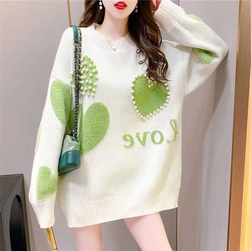 Женский вязаный пуловер с жемчугом, свободный элегантный свитер с сердечками и бусинами, 2020