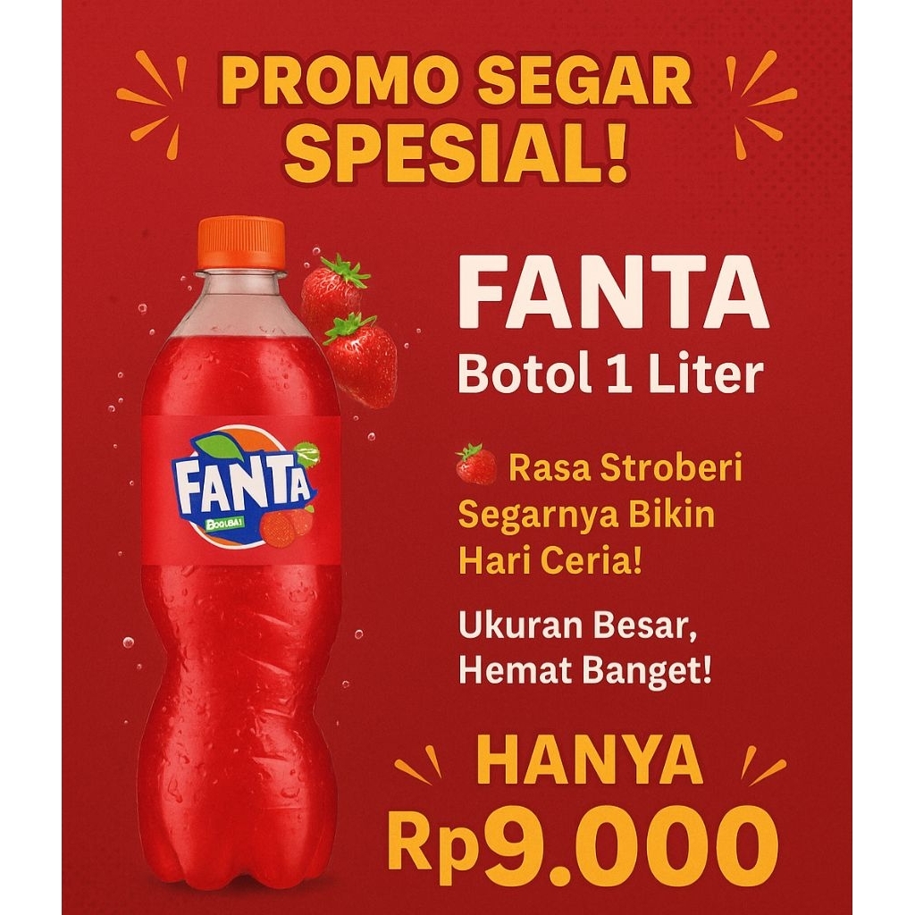Fanta Strawberry 1 Liter adalah minuman ringan berkarbonasi dengan rasa stroberi yang menyegarkan dan manis. Dikemas dalam botol plastik (PET) ukuran 1 liter yang praktis, produk ini cocok untuk dinikmati bersama keluarga atau teman dalam berbagai suasana, seperti pesta, makan bersama, atau bersantai di rumah.