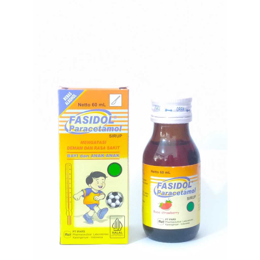 Deskripsi: Fasidol merupakan obat analgesik-antipiretik yang dapat digunakan untuk menurunkan demam, meredakan nyeri seperti sakit gigi dan sakit kepala. | Komposisi: Tiap 5 mL sirup mengandung paracetamol 120 mg | Dosis: Anak 0-1 tahun: 1/2 sendok takar, 3-4 kali perhari.Anak 1-2 tahun: 1 sendok takar, 3-4 kali perhari.Anak 2-6 tahun: 1-2 sendok takar , 3-4 kali perhari.Anak 6-9 tahun: 2-3 sendok takar,3-4 kali perhari.Anak 9-12 tahun: 3-4 sendok takar, 3-4 kali perhari. | Indikasi: Digunakan untuk meringankan rasa sakit seperti sakit gigi, sakit kepala, dan menurunkan demam | Perhatian Khusus: Pemberian tidak lebih dari 5 x sehari, Hati-hati menggunakan obat ini pada pasien dengan gangguan fungsi hati dan ginjal | Kemasan: Dus, botol @ 60 mL sirup