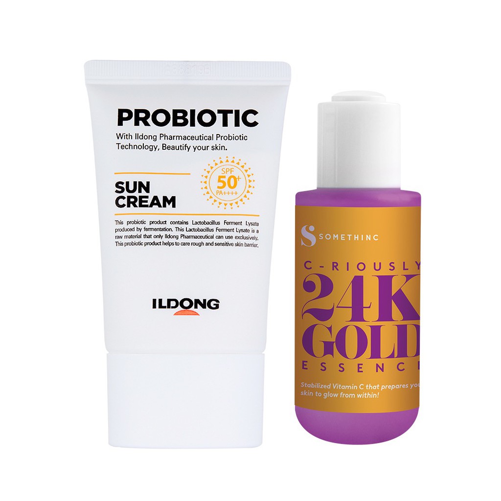 Isi Bundle : - CRIOUSLY GOLD 24K Essence 40ml- FIRST LAB Probiotic SunCream SPF50+ PA++++ (50ml)All FIRST LAB's Skincare are using a Patented Probiotic Technology from ILDONG Pharmaceutical Korea.Probiotics can influence the balance & the composition of skin microflora. Through the natural process of fermentation, probiotic bacteria produce acid compounds such as lactic acid that lowers the skin pH. The acid pH prevents the growth of the most harmful bacteria.(Stabilized) Vitamin C that prepares your skin to glow from within!A water-soluble derivative of Vitamin C, high-stability, & safe for sensitive skin.Infused with 24k Gold, preserve key substances skin needs to look smoother, visibly target dullness, uneven tones, brighter, and younger.With a Light texture & not easy to Oxidize , this Vitamin C applies smoothly to the skin, delivering antioxidants that help to brighten, Fight UV rays, and reduce signs of aging (anti aging) by stimulating collagen synthesis and inhibiting melanin production.Safe for sensitive skin ( Day & Night) & would become an Extraordinary if you pair it with with Somethinc Niacinamide Moisture Beet SerumpH : 5-7NOTE: DO NOT COMBINE WITH AHA/BHA TOGEHER with This Vitamin C. Jika ingin menggunakan retinol, harap gunakan Somethinc HYALURONIC B5 juga untuk memberikan extra hidrasi pada kulit.NA18201900122