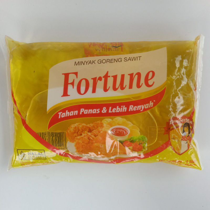 Minyak goreng Fortune kemasan bantal 1 liter.