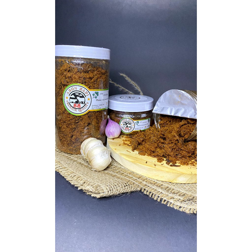 Abon sapi yang terbuat dari daging sapi pilihan, dengan cita rasa yang gurih dan renyah.