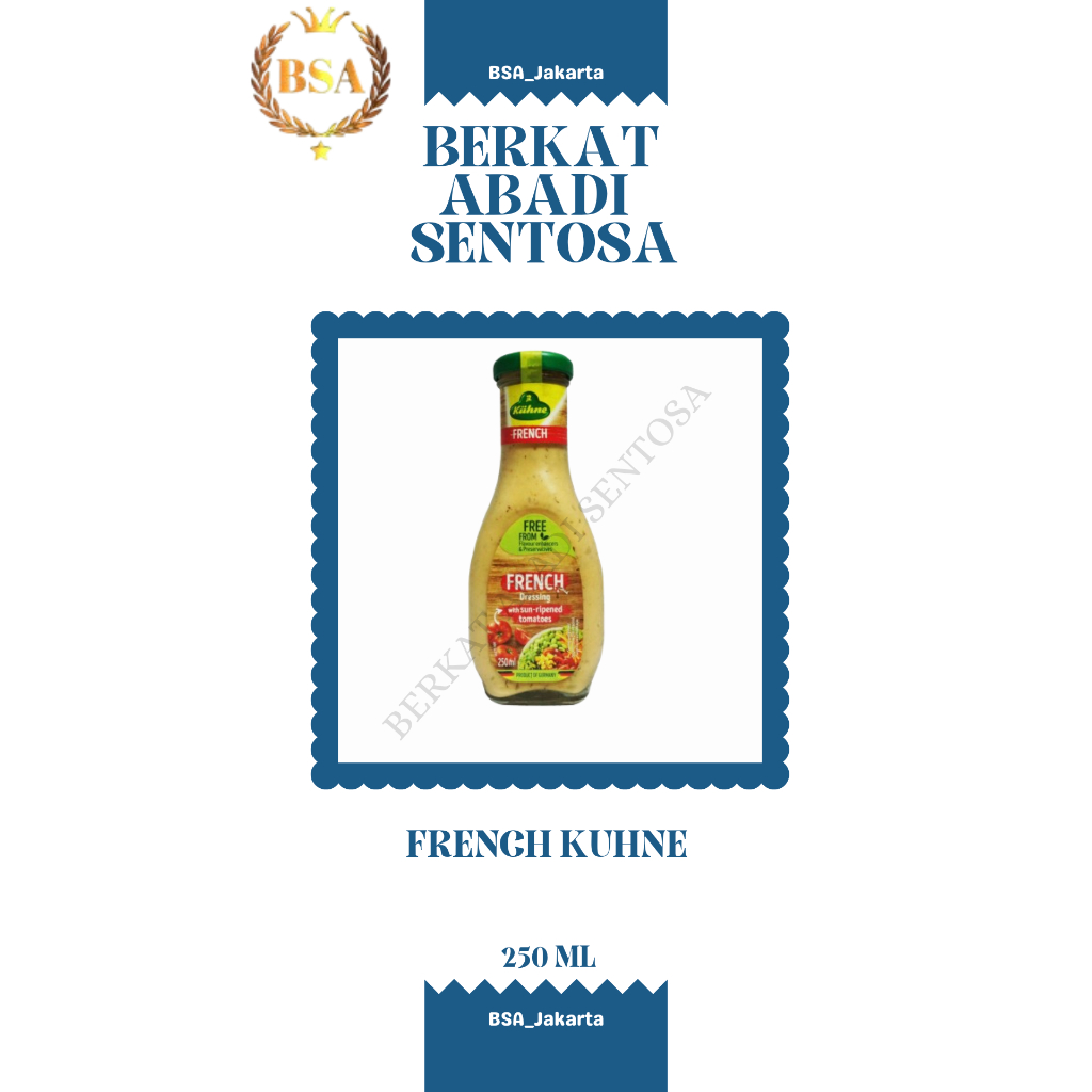 Kuhne French Salad Dressing adalah saus salad yang kaya rasa dan aromatik, dibumbui dengan rempah khas masakan Prancis, dan dilengkapi dengan pasta tomat. Saus ini cocok untuk berbagai jenis salad, serta lezat dipadukan dengan koktail udang dan telur rebus.