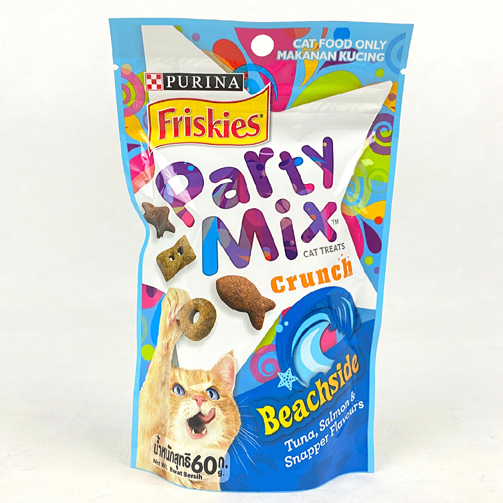 Friskies Party Mix Beachside Crunch Adult Cat Treats * Real ocean whitefish is the #1 Ingredient * Made with flavors of shrimp, crab & tuna * Less than 2 calories per cat treat With a crunchy texture that helps clean teeth * Complete & balanced treats for adult catsIngredients & NutritionOcean whitefish, chicken meal, brewers rice, chicken by-product meal, animal fatpreserved with mixed-tocopherols, pea starch, barley, corn gluten meal, animalliver flavor, natural and artificial flavors, cassava root flour, phosphoricacid, calcium carbonate, potassium chloride, brewers dried yeast, salt, shrimpmeal, crab meal, tuna meal, choline chloride,MINERALS[zinc sulfate, ferroussulfate, manganese sulfate, copper sulfate, calcium iodate, sodium selenite],taurine, L-ascorbyl-2-polyphosphate (Vitamin C),VITAMINS[Vitamin E supplement,niacin (Vitamin B-3), Vitamin A supplement, calcium pantothenate (Vitamin B-5),thiamine mononitrate (Vitamin B-1), riboflavin supplement (Vitamin B-2), VitaminB-12 supplement, pyridoxine hydrochloride (Vitamin B-6), folic acid (VitaminB-9), Vitamin D-3 supplement, biotin (Vitamin B-7), menadione sodium bisulfitecomplex (Vitamin K)], Yellow 5, citric acid, Yellow 6, Red 40, Blue 2, BHA (apreservative), BHT (a preservative)Guaranteed AnalysisCrude Protein (Min)29.0%Crude Fat (Min)15.0%Crude Fiber (Max)4.0%Moisture (Max)8.0%Feeding GuidelinesFeed your adult cat 2 treats for each 1 pound of body weight, not to exceed upto 10 treats daily as a reward or tasty snack. Purina Friskies Party MixBeachside Crunch provides 100% complete and balanced nutrition for adult cats sothat it will not dilute the nutritional value of your cat’s regular maintenancediet. To maintain your cat’s proper weight, reduce the amount of cat foodoffered proportionately to the amount of snacks you feed your cat.Calorie Content (calculated):4002 kcal/kg1.3 kcal/piece