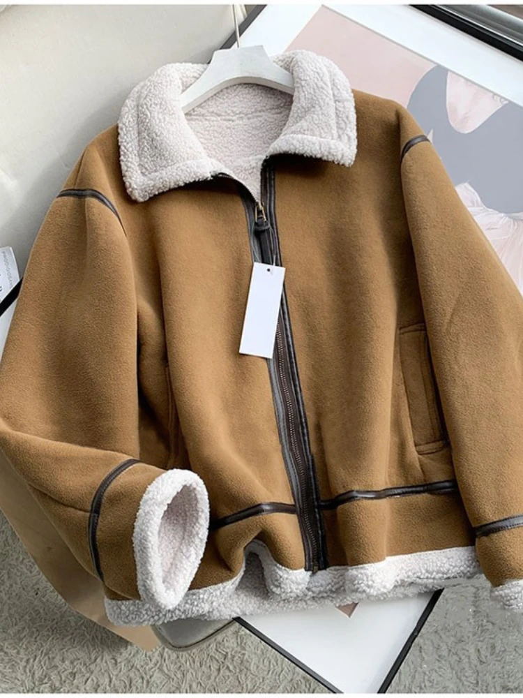 FTLZZ новое осенне-зимнее женское винтажное повседневное толстое теплое байкерское пальто в байкерском стиле женская уличная куртка из искусственной кожи с отворотами из овечьей шерсти