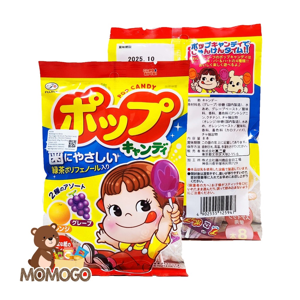Permen lolipop mini khas jepang yang di produksi oleh fujiya. permen ini memiliki berbagai rasa, seperti anggur dan jeruk. permen lolipop mini yang ramah gigi karena dicampur dengan polifenol teh hijau. menggunakan tongkat kertas yang aman. kemasannya unik dan mudah dibawa