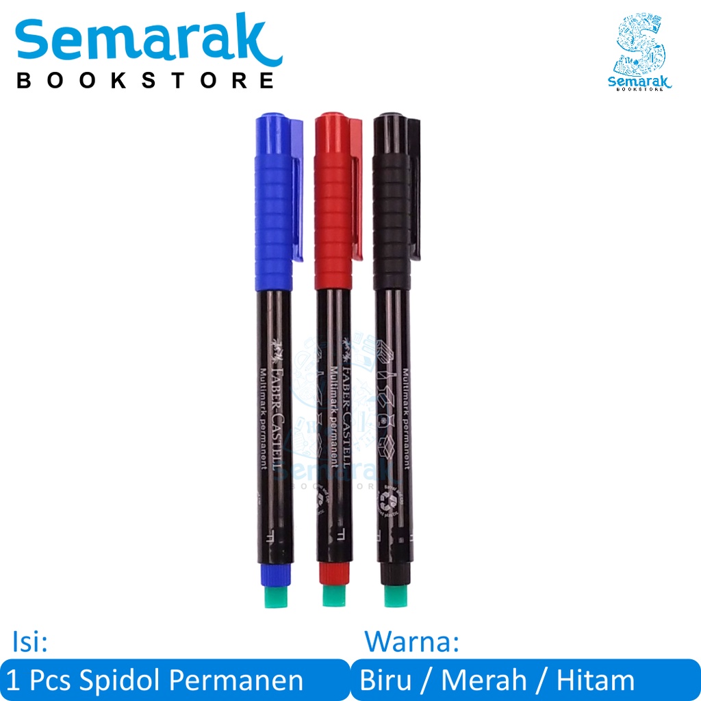 Faber Castell Multimark Permanent merupakan spidol permanen serbaguna untuk menulis, menghias dan membuat sketsa. Tinta spidol tahan air dan permanen. Solusi untuk tanda tangan diatas materai, foto, dan ijazah. Dilengkapi dengan penghapus khusus. Dapat digunakan untuk menandai slide film, plastik, kardus, CD, dan lain-llain.