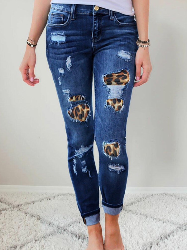 Fashion Slim Leopard Print Ripped Stretch Jeans