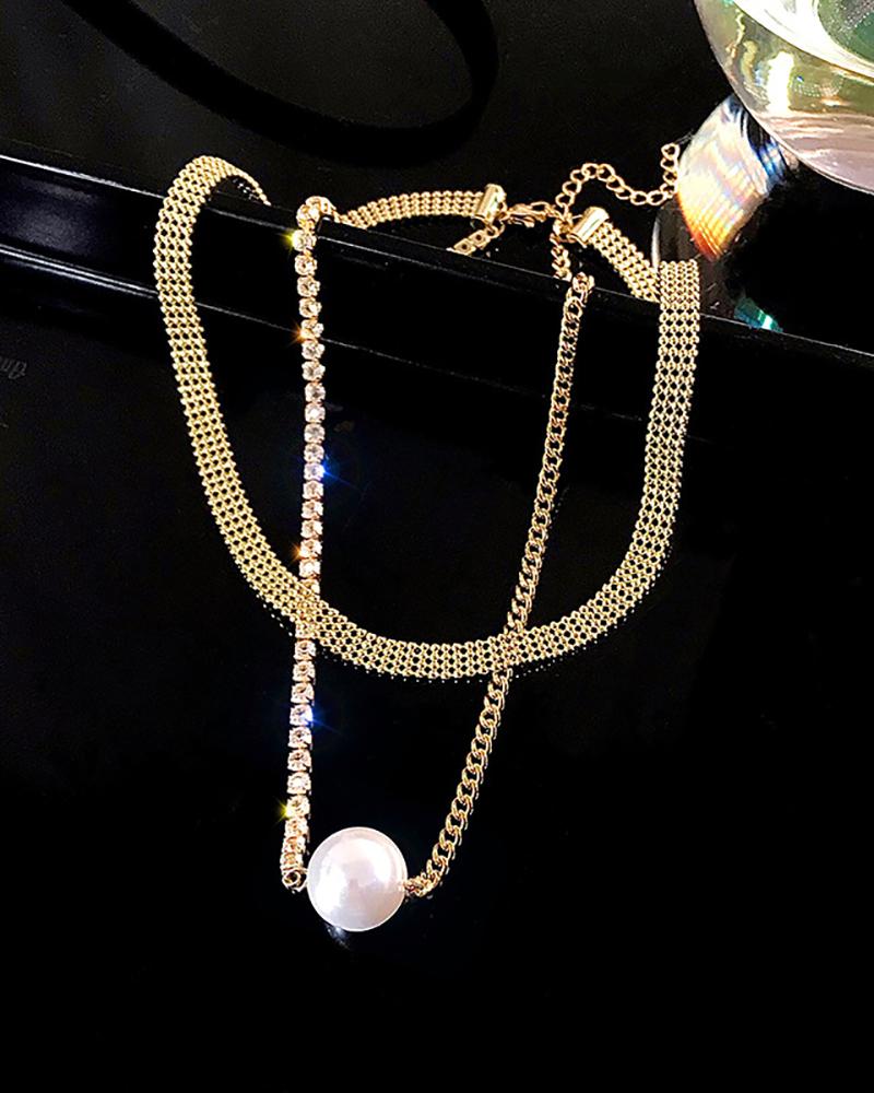 Faux Pearl Pendant Rhinestone Chain Layered Necklace, Gold
