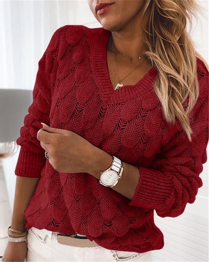 Feather Pattern Knitted V-Neck Sweater, Red