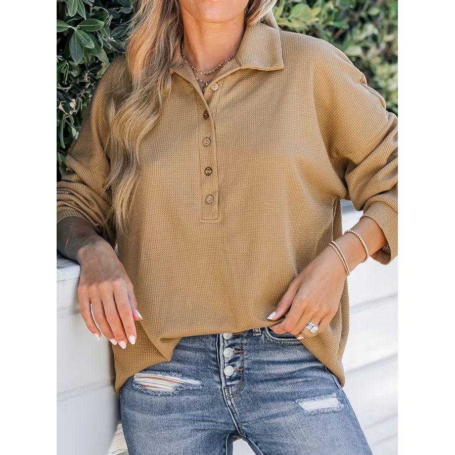 top da donna,felpa casual con risvolto in tessuto waffle da donna