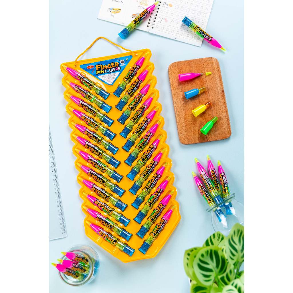 Permen Lollipop Liky Fingerpen => permen lolipopp dengan wadah unik yang dapat ditancapkan di jari tangan sehingga menyerupai jari tangan, 3 permen dan 1 pulpen kecil. setelah permennya habis wadahnya dapat dijadikan sebagai pulpen.