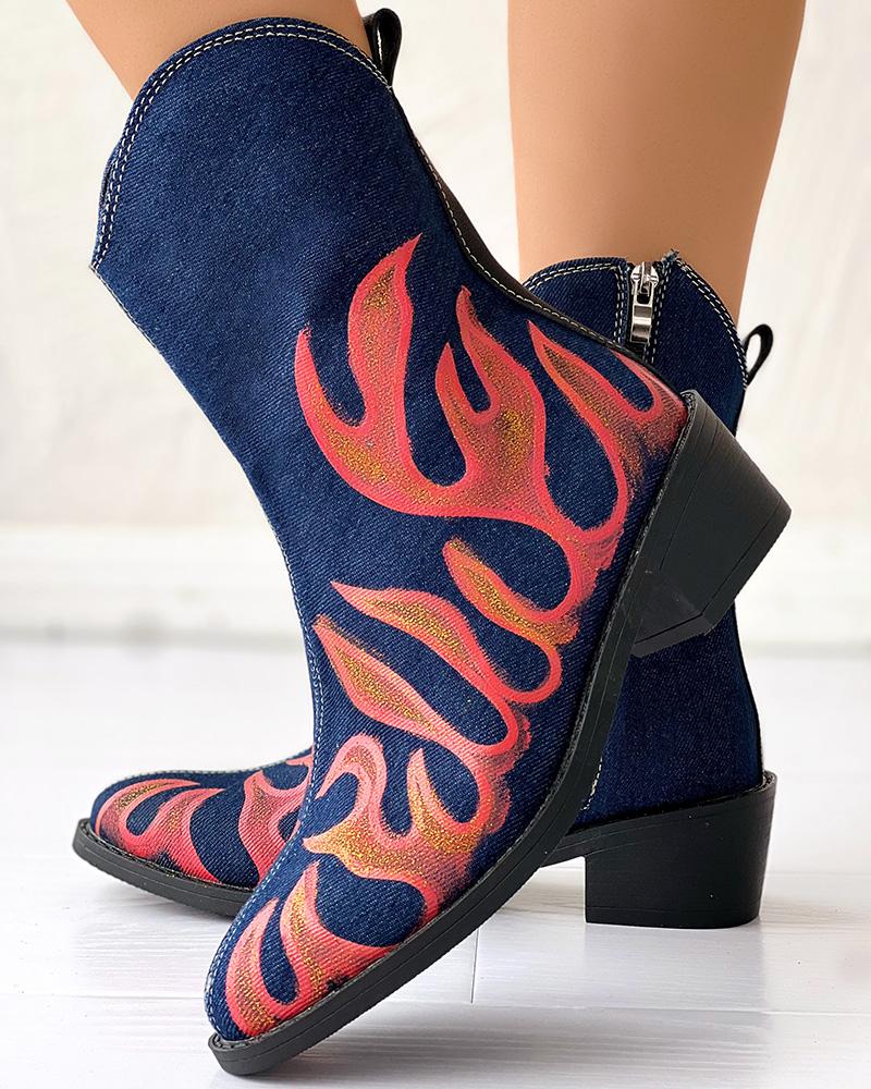 Fire Graphic Print Point Toe Chunky Heel Ankle Boots, Red