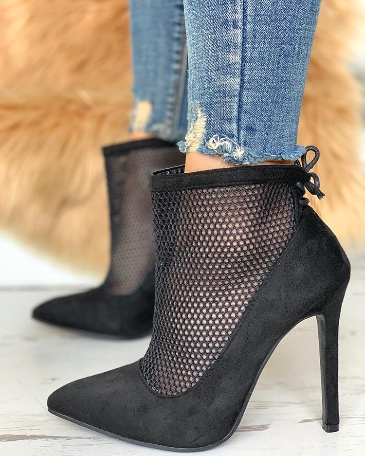 Fishnet Splicing Pointed Toe Ankle Boots, Black