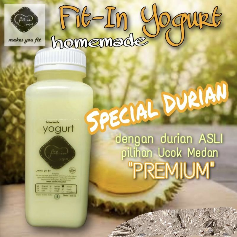 Fit-In Yogurt tersedia dalam rasa DURIAN dengan daging durian premium asli pilihan Ucok Medan