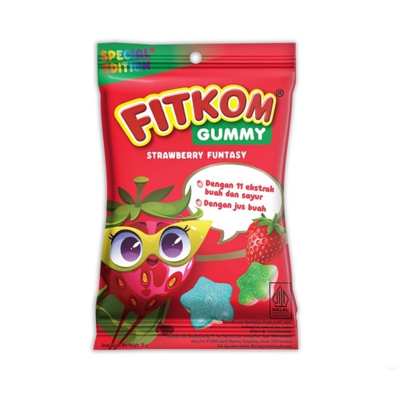 Fitkom Gummy Fruit & Veggie adalah kembang gula jeli aneka rasa dengan kandungan vitamin dari ekstrak buah-buahan dan sayuran, yang bermanfaat sebagai antioksidan dan memenuhi kebutuhan vitamin pada anak usia pertumbuhan. Fitkom Gummy Fruit Veggie memberi manfaat untuk membantu memenuhi kebutuhan buah dan sayur pada anak. Indikasi Umum: Memenuhi kebutuhan vitamin dan mineral pada anak di masa pertumbuhan.