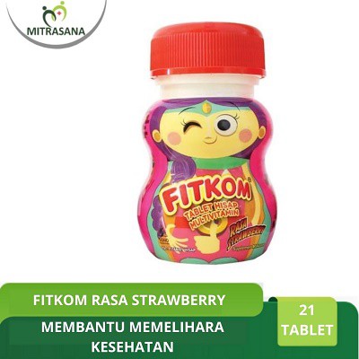 Suplemen untuk membantu memenuhi kebutuhan vitamin dan mineral pada anak-anak di usia pertumbuhan.ManfaatSebagai suplemen untuk membantu memenuhi kebutuhan vitamin dan mineral pada anak-anak di usia pertumbuhan. Membantu memelihara kesehatan anak-anak Membantu memulihkan kondisi tubuh anak-anak sehabis sakit.KeunggulanSetiap tablet hisap FITKOM dengan Rasa Strawberry mengandung : Ekstrak Echinaceae 250 mg Ekstrak Curcuma Xanthorrhizza 10 mg Vitamin A 1000 IU Vitamin B1 1,4mg Vitamin B2 1,6mg Vitamin B6 2mg Vitamin B12 3mcg Vitamin C 60mg Vitamin D3 100 I.U Vitamin E 5mg Nicotinamide (Vit. B3) 6mg Calcium Pantothenate 5mg FD & C Red 3 (CI-45430), Bahan pengisi, AromaPemakaianAnak-anak Sehari 3 x 1 Tablet Hisap