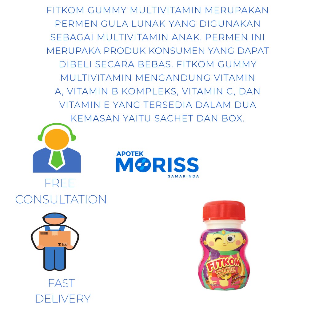 Fitkom Multivitamin berfungsi untuk menjaga daya tahan tubuh anak dari serangan penyakit. Fitkom Multivitamin mengandung kalsium pantotenate yang diketahui sejak lama berguna untuk mencegah kerusakan sel dalam tubuh. Dilengkapi nikotinamida yang efektif mencegah terjadinya pembengkakan pada kulit sekaligus menyembuhkan gejala diare.Perpaduan beberapa vitamin lainnya seperti vitamin A, vitamin B, vitamin C, dan vitamin D dapat membantu pemenuhan vitamin harian anak agar tetap fit menjalani rutinitas. Nafsu makan berkurang, gejala anemia, bahkan pemulihan pasca operasi dapat diatasi dengan Fitkom Multivitamin.Perhatikan penggunaan multivitamin ini sesuai dengan anjuran pada kemasan atau dari tenaga kesehatan lainnya. Beli Fitkom Multivitamin online dengan harga terbaik hanya di Toko SehatQ, pasti asli!