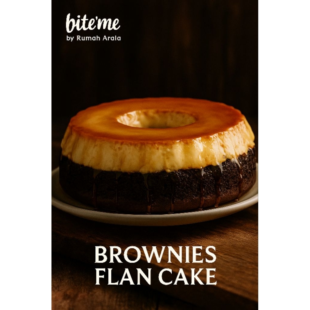 Kek coklat lembut dengan flan karamel yang creamy di atasnya. Diameter 16cm