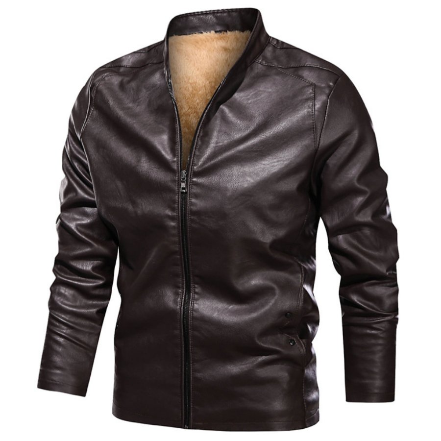 Fleece Padded Stand-Collar Leather Jacket