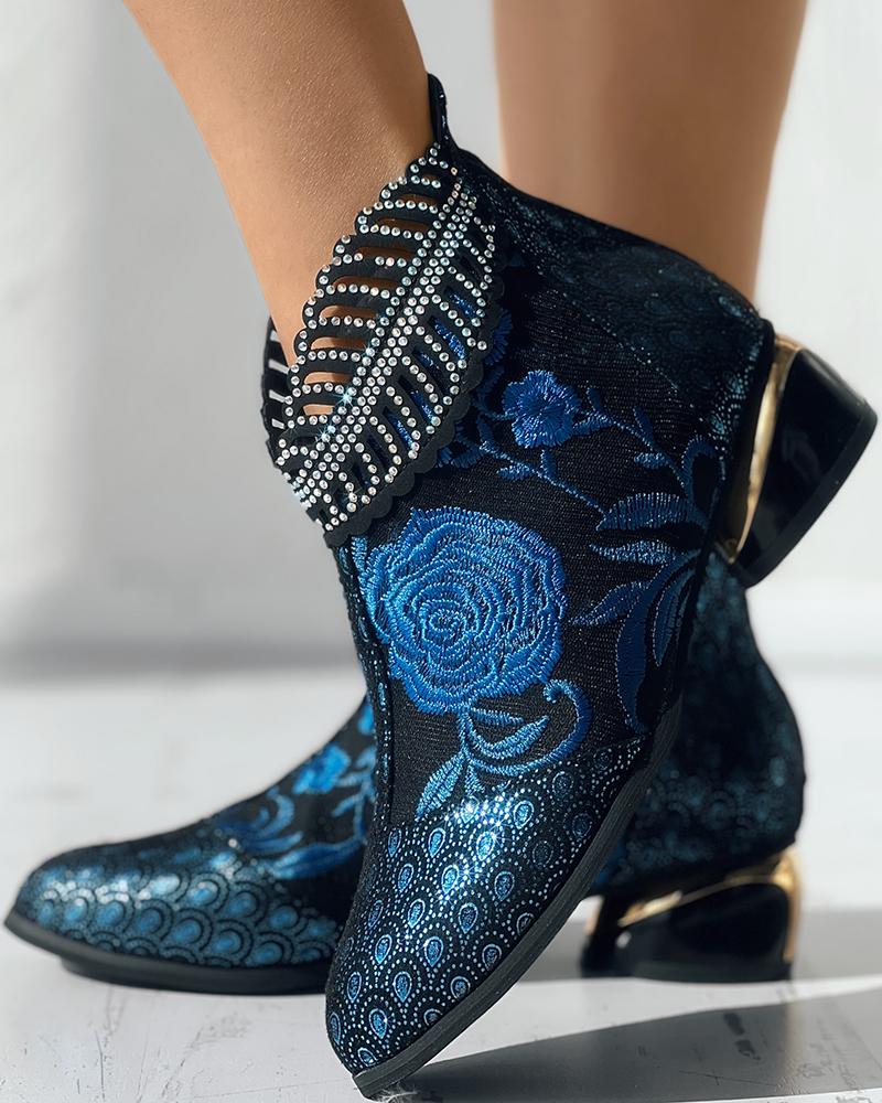 Floral Embroidery Rhinestone Leaf Pattern Ankle Boots, Black&blue