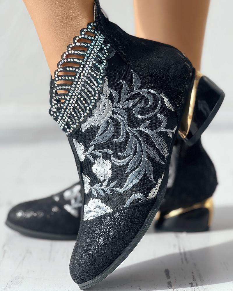 Floral Embroidery Rhinestone Leaf Pattern Ankle Boots, Black&gray