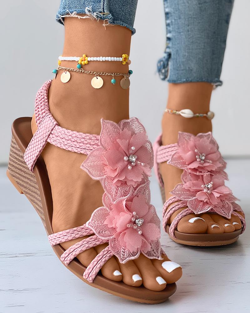 Floral Pattern Beaded Boho Wedge Shoes, Pink