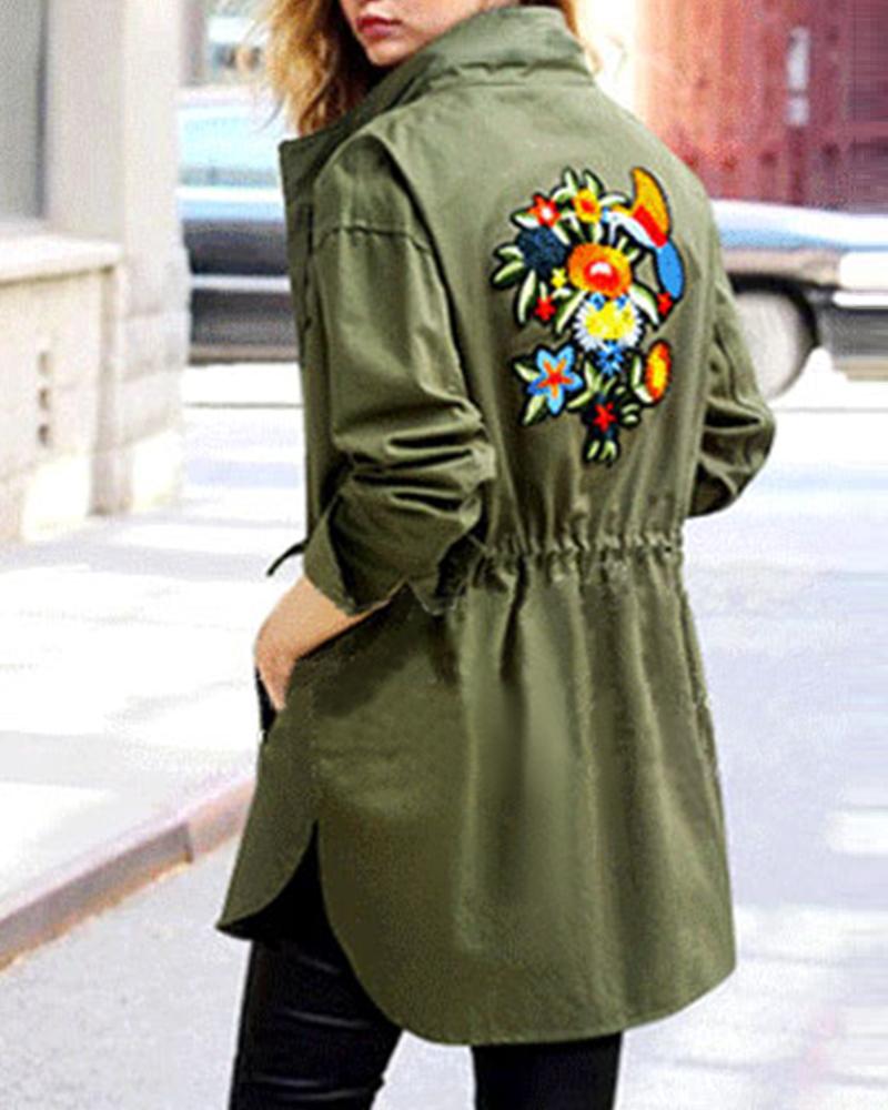 Floral Pattern Button Design Drawstring Coat, Green