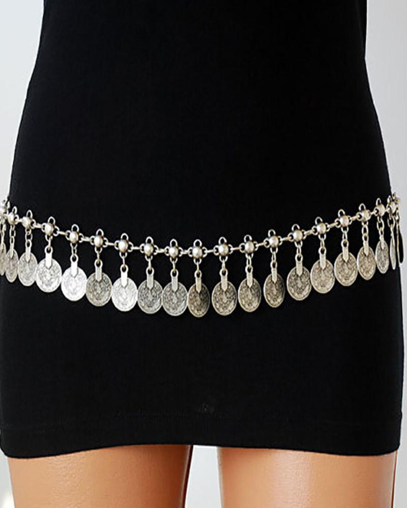 Floral Pattern Coin Decor Waist Chain, Silver