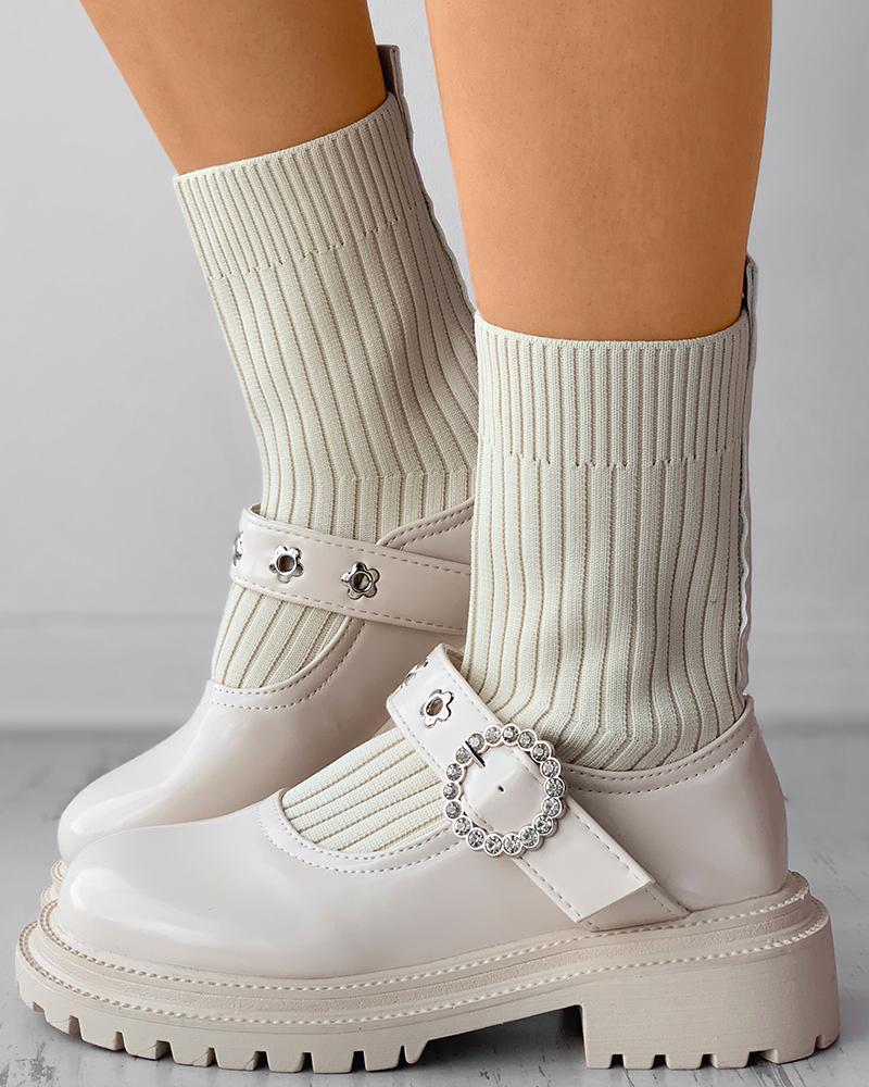 Floral Pattern Eyelet Rhinestone Decor Chunky Mary Jane Sock Boots, Beige