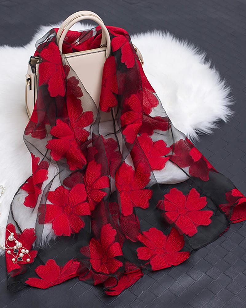 Floral Pattern Mesh Scarf, Red