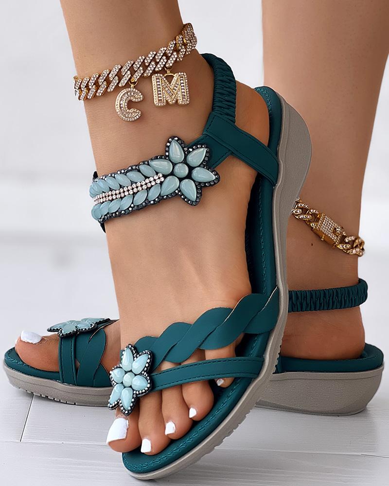 Floral Pattern Rhinestone Summer Beach Sandals, Green