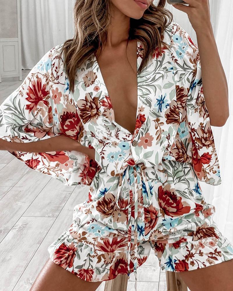Floral Print Buttoned Drawstring Ruffles Romper, Style1