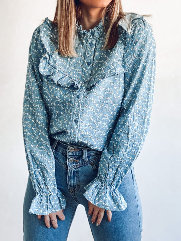 blouses,floral print lace stand-up collar shirt