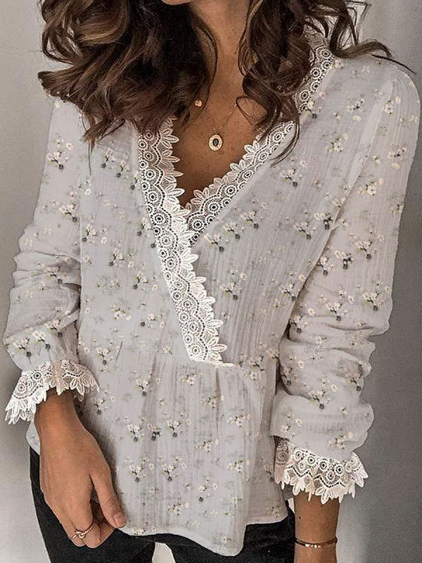 Floral Print Lace V-Neck Long Sleeve Blouse