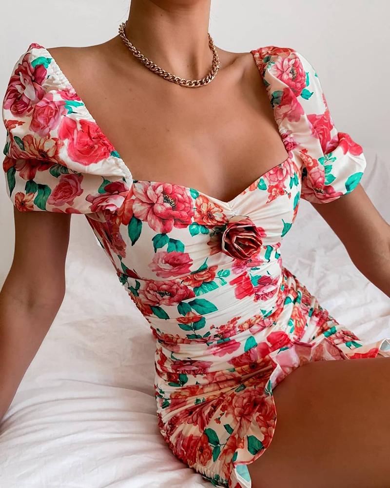 Floral Print Ruched Ruffles Dress, Red