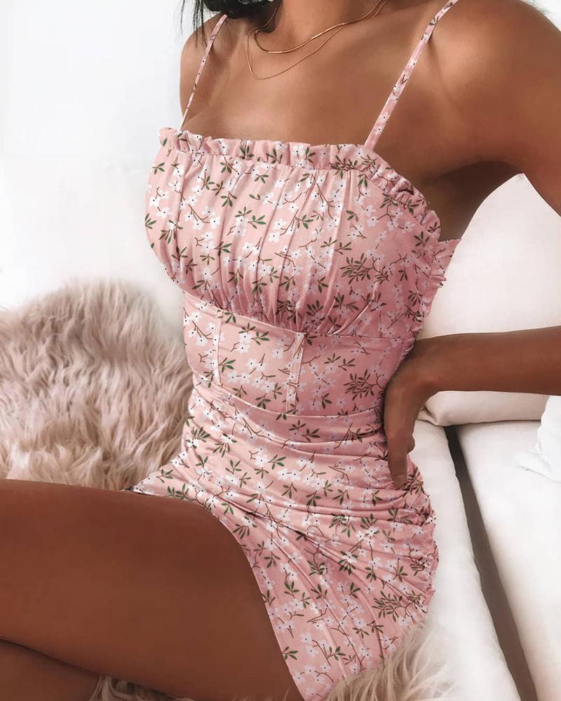 Floral Print Ruched Ruffles Mini Dress, Pink